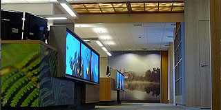 Visitors are greeted by native bird song as they approach the Centre and enter the ground floor reception area. Further into the interior space is a large marine aquarium displaying marine life to be found around New Zealand and the pacific basin. Foreshore sounds enhance the visual experience, and together with the theatrical lighting effects provide a totally submersive environment. This theme is carried down into the basement where the radiation therapy is conducted.